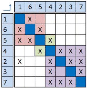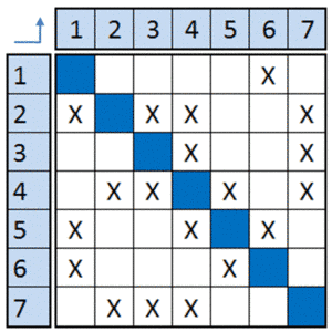 As a simple example, consider a development process that includes seven participants as shown in the DSM, below. Note that the interactions between different participants are also shown in the DSM. If we were to form several development teams within this project, what will be the number of teams required and the membership of each team?