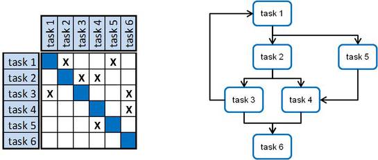 The figure shows a simple process consisting of six tasks that are shown as a flow chart on the right hand side and a DSM representing that process on the left hand side. There are numerous algorithms to analyze the overall structure of the relationships within a DSM, e.g. tearing, banding and partitioning, or the analysis for different structural properties (see DSM tutorial).