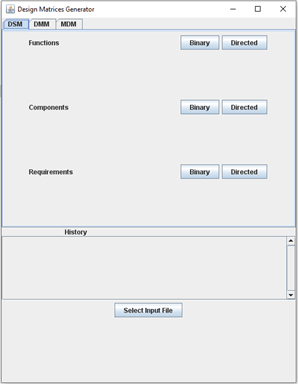 To use the tool, proceed to clone the repository or download the latest release. Afterwards go to the folder “Application” and run either the executable MB2DM-1.0.exe or the Java application MB2DM-1.0.jar depending on your operating system. On the User Interface you will be able to select an input file (The current release works with TTool XML files. Examples can be found at: https://gitlab.telecom-paris.fr/mbe-tools/TTool/-/tree/master/modeling/AVATAR ). Afterwards select the type of matrix you desire, either a Design Structure Matrix (DSM), a Domain Mapping Matrix (DMM) or a Multi-Domain Matrix (MDM) and later its specific type. You can select consequently several types of matrices. You are able to see in the History log which matrices have been requested and can be found on the output files folder. The output files are saved as .xlsx by default and can be found in the “design_matrices” folder inside the “Application” folder.