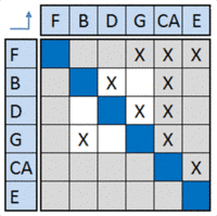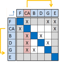 Sequencing is the reordering of the DSM rows and columns such that the new DSM arrangement does not contain any feedback marks, thus transforming the DSM into an upper triangular form. For complex engineering systems, it is highly unlikely that simple row and column manipulation will result in an upper triangular form. Therefore, the analyst’s objective changes from eliminating the feedback marks to moving them as close as possible to the diagonal (this form of the matrix is known as block triangular). Equally, it is possible to learn about what elements of the system might possibly have to be reworked (e.g. split into two elements or perhaps removed) to achieve a better process architecture.